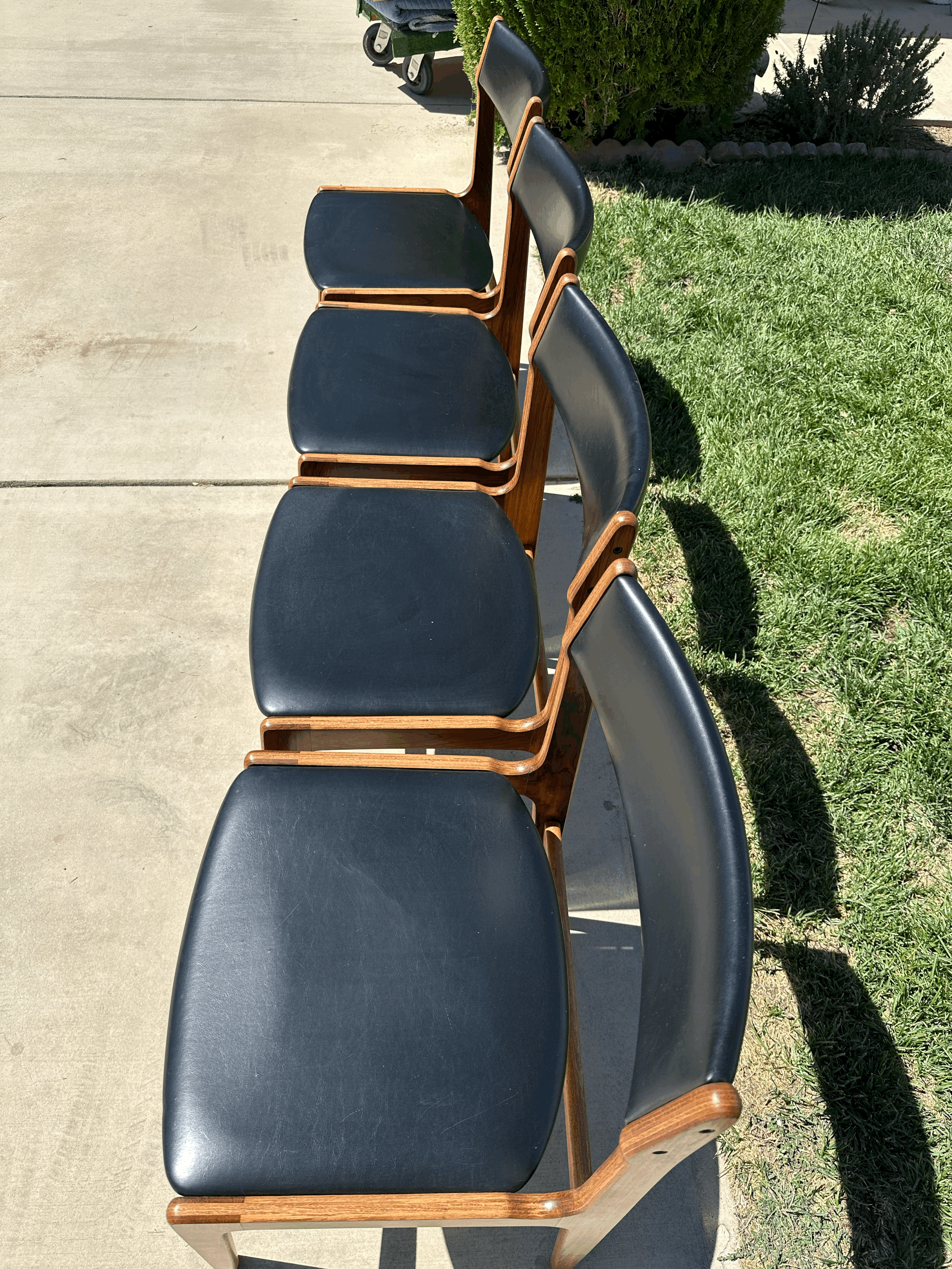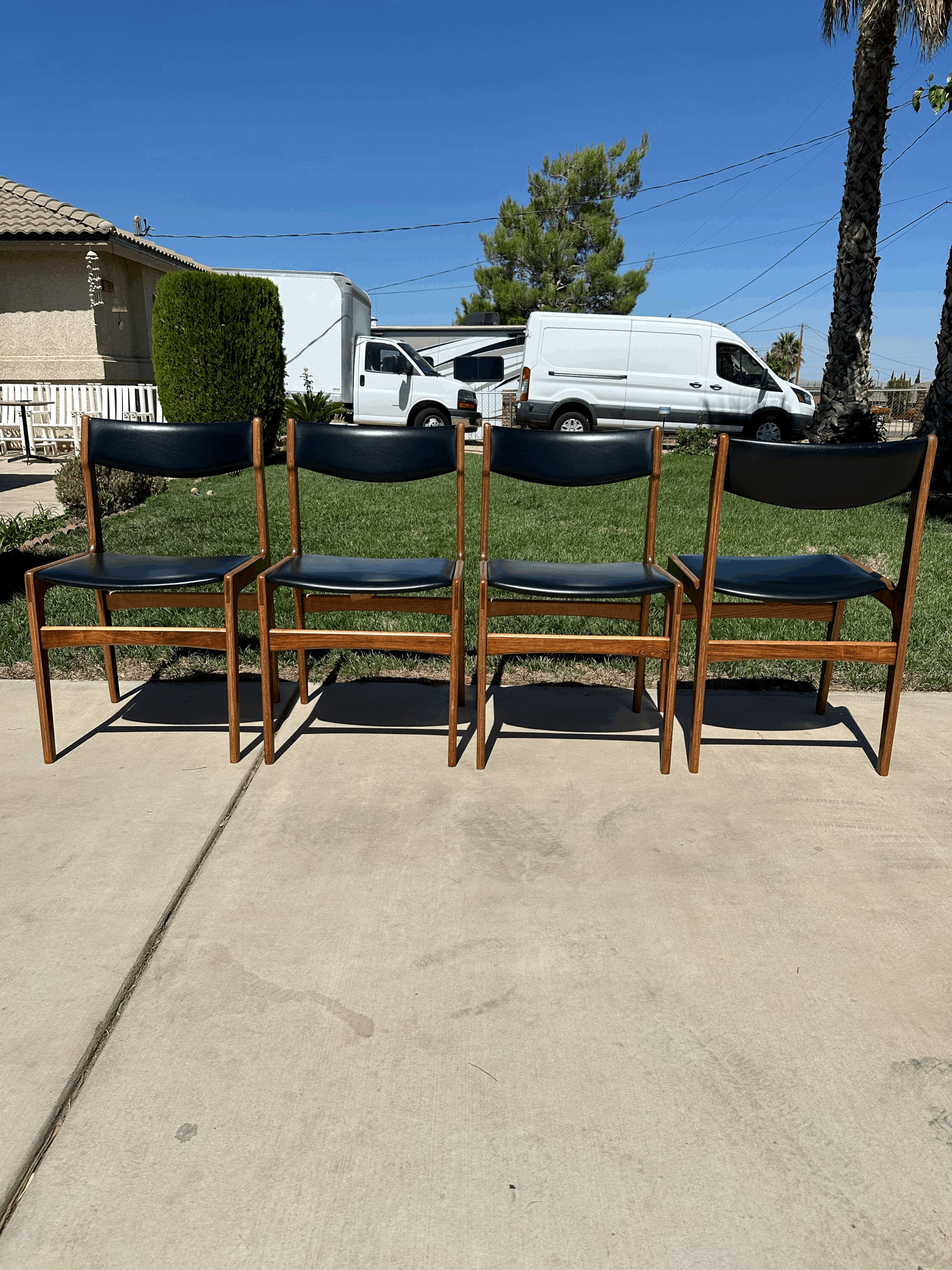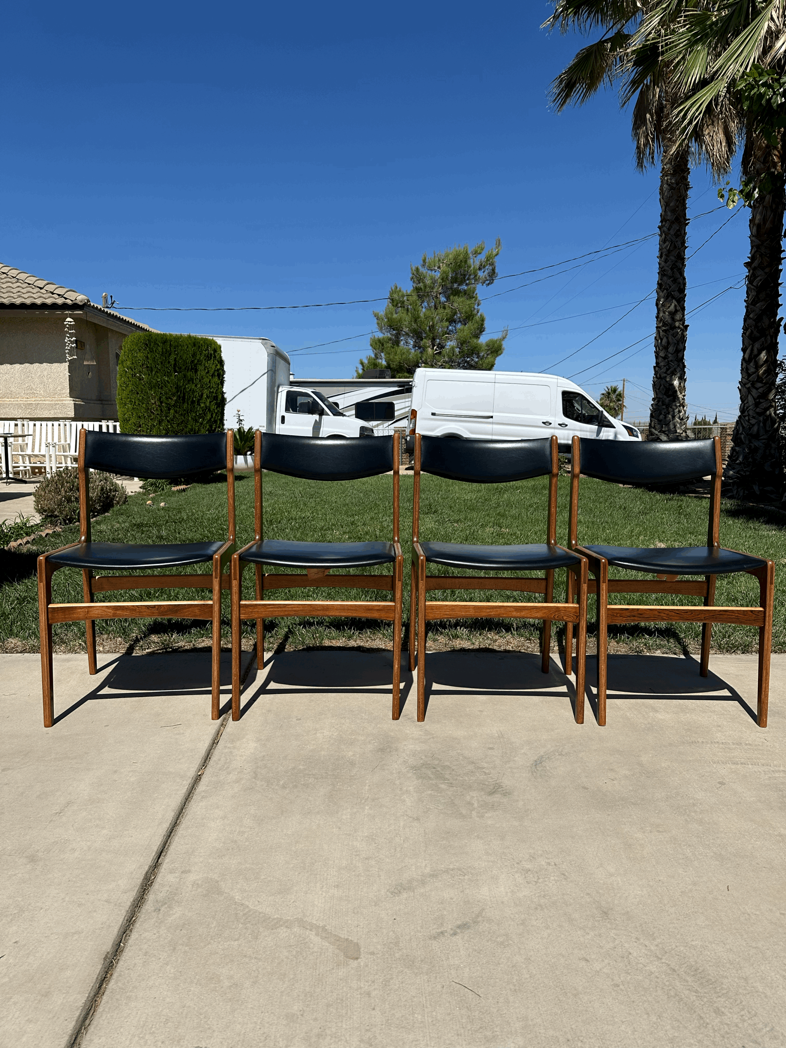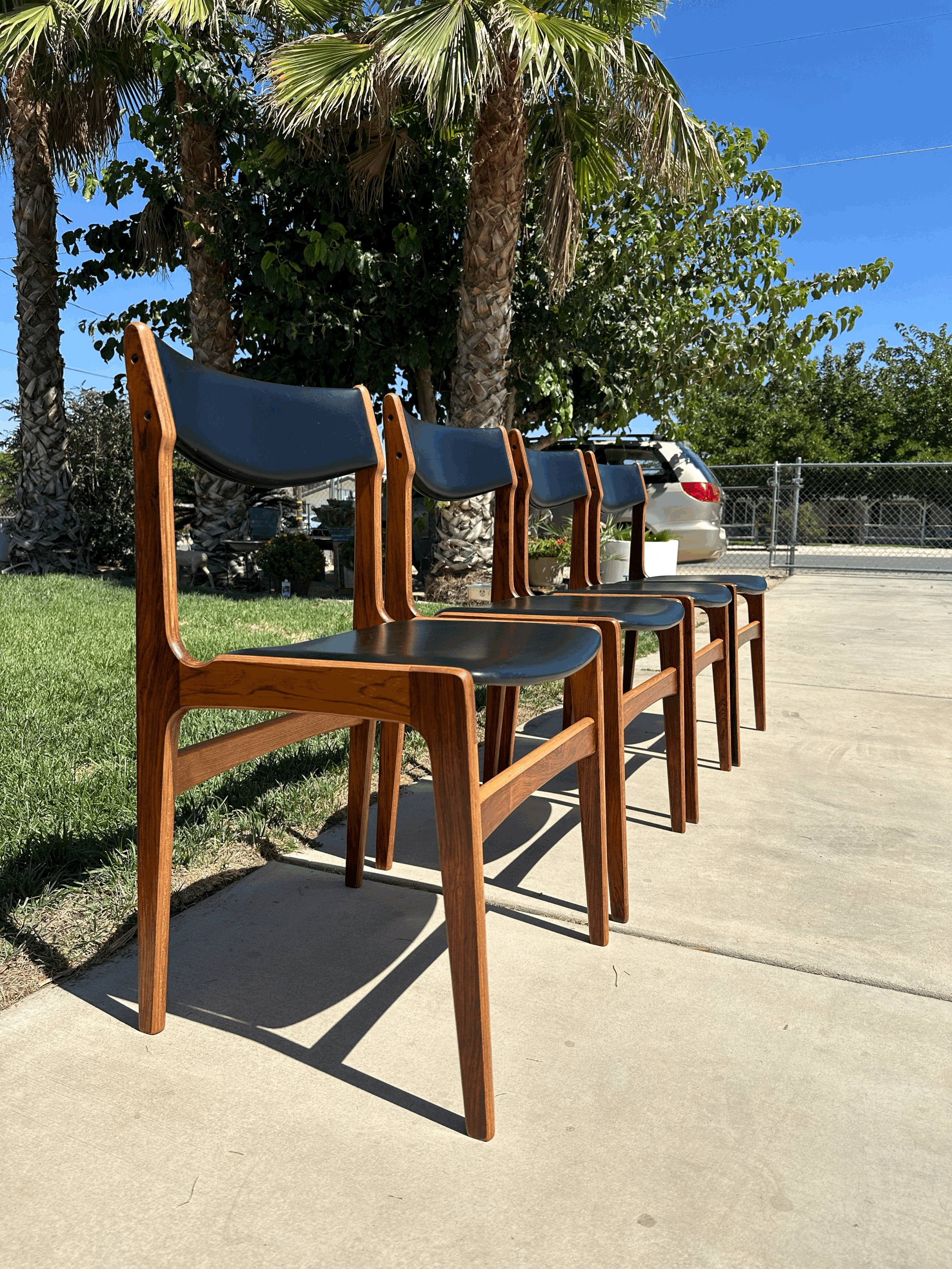 Professionally refinished and reupholstered dining chairs in excellent condition. Teak wood with a chenille type fabric. Very soft and sturdy chairs.