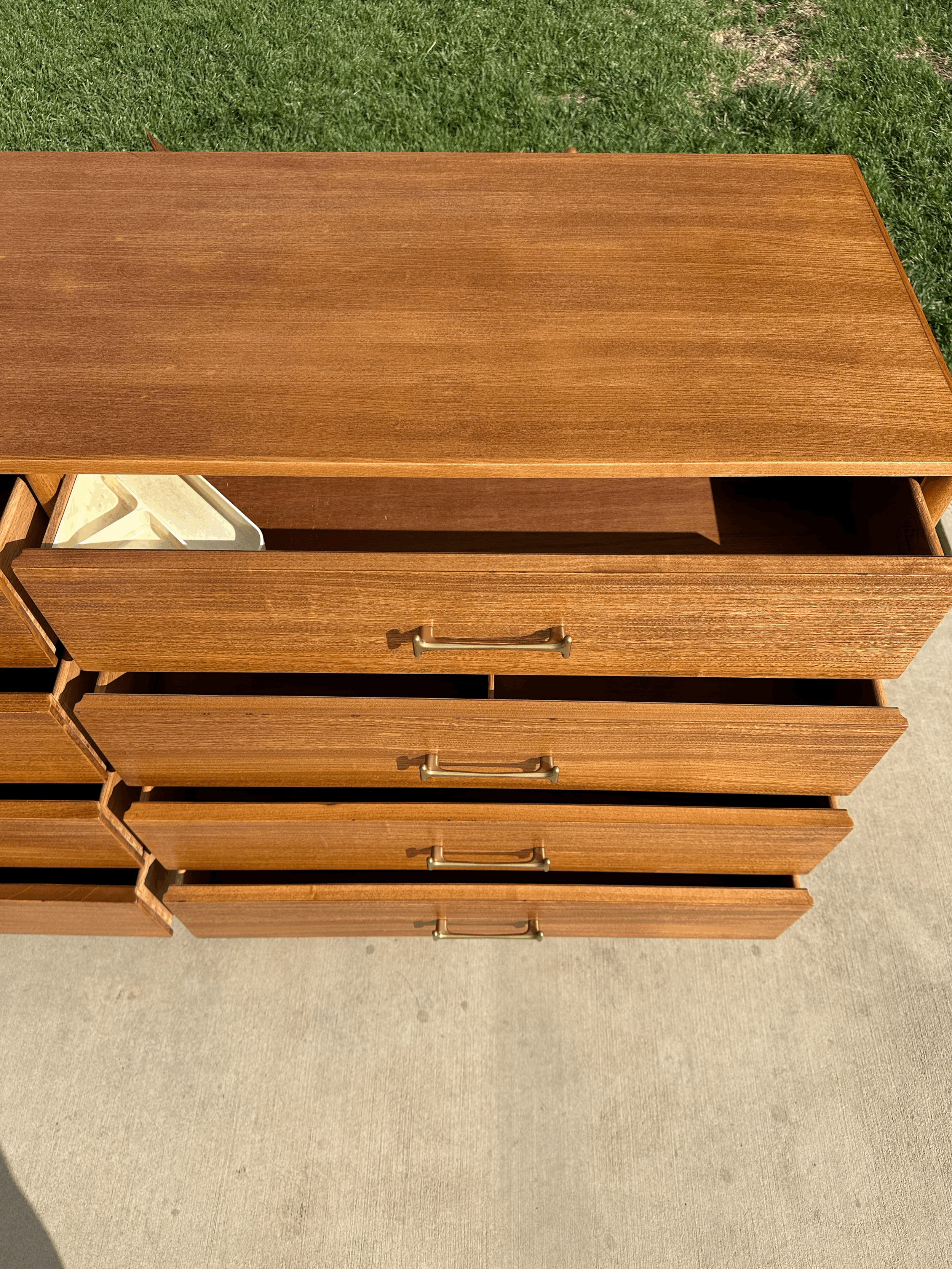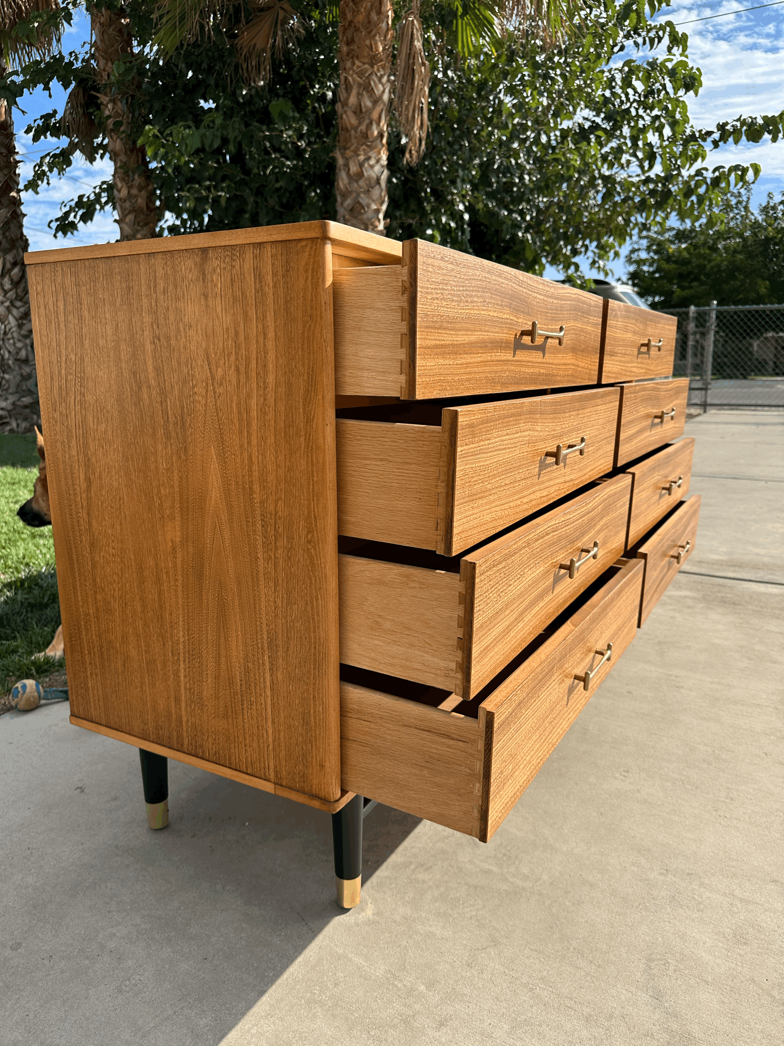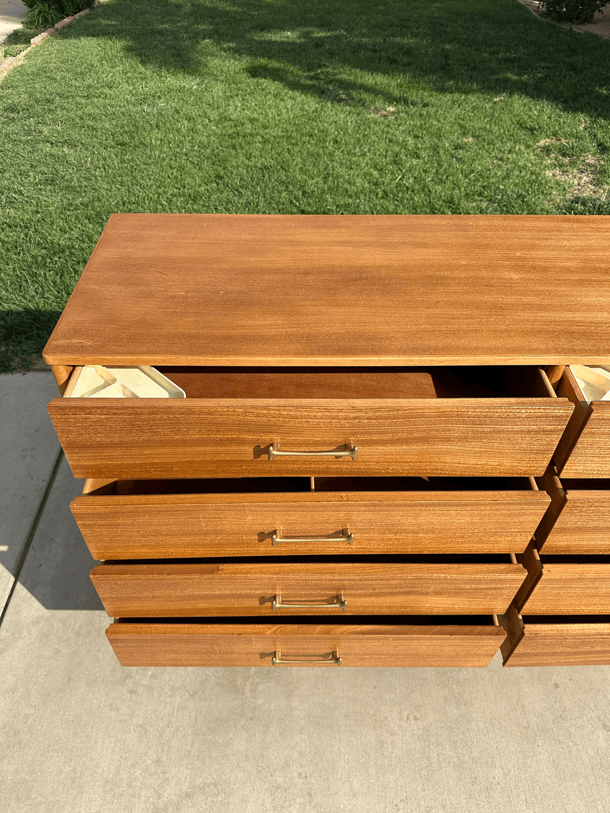 Refinished solid wood dresser in excellent condition. This beautiful dresser by Ace-Hi furniture includes 14 drawers total perfect for those who love to change and add fashion to their wardrobe. Top 5) 3 in depth, 6-14) 5.25 in depth.