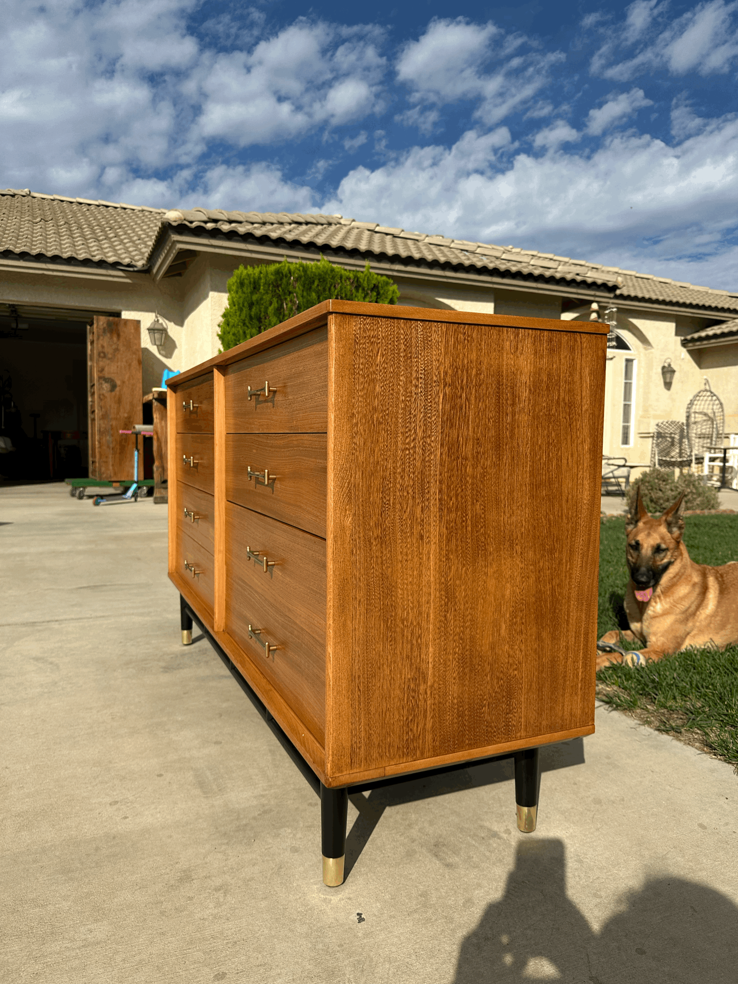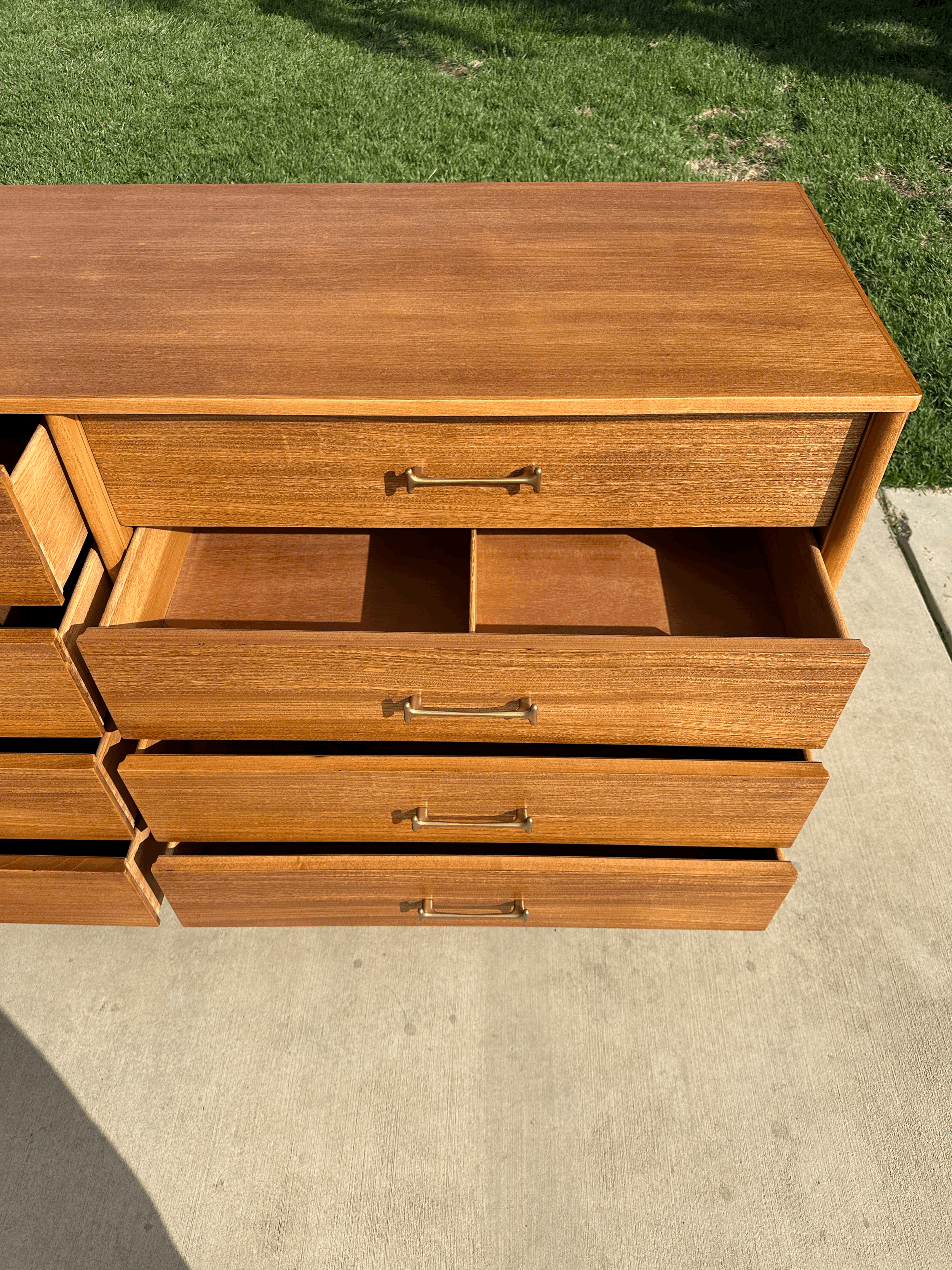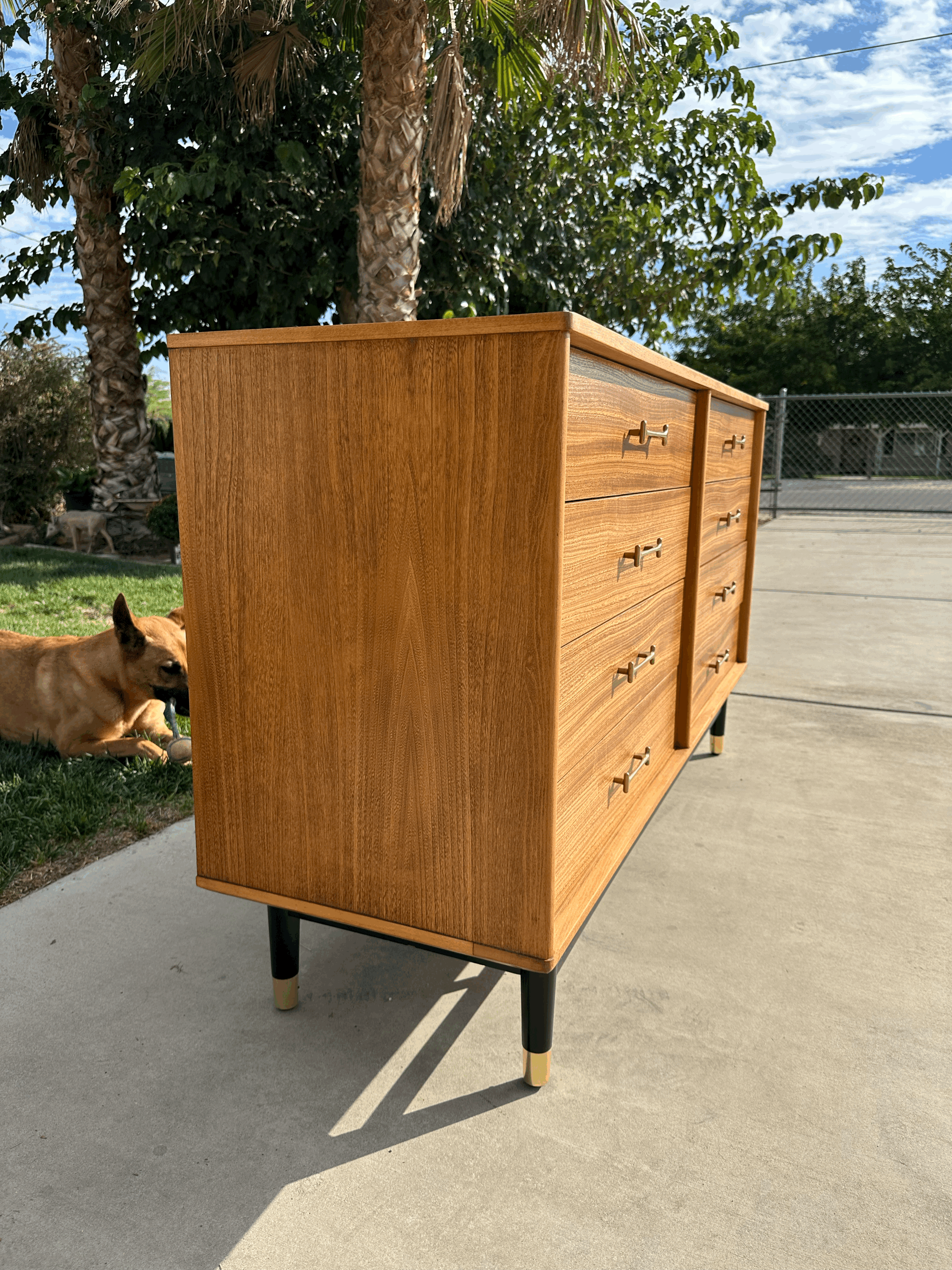 Refinished solid wood dresser in excellent condition. This beautiful dresser by Ace-Hi furniture includes 14 drawers total perfect for those who love to change and add fashion to their wardrobe. Top 5) 3 in depth, 6-14) 5.25 in depth.