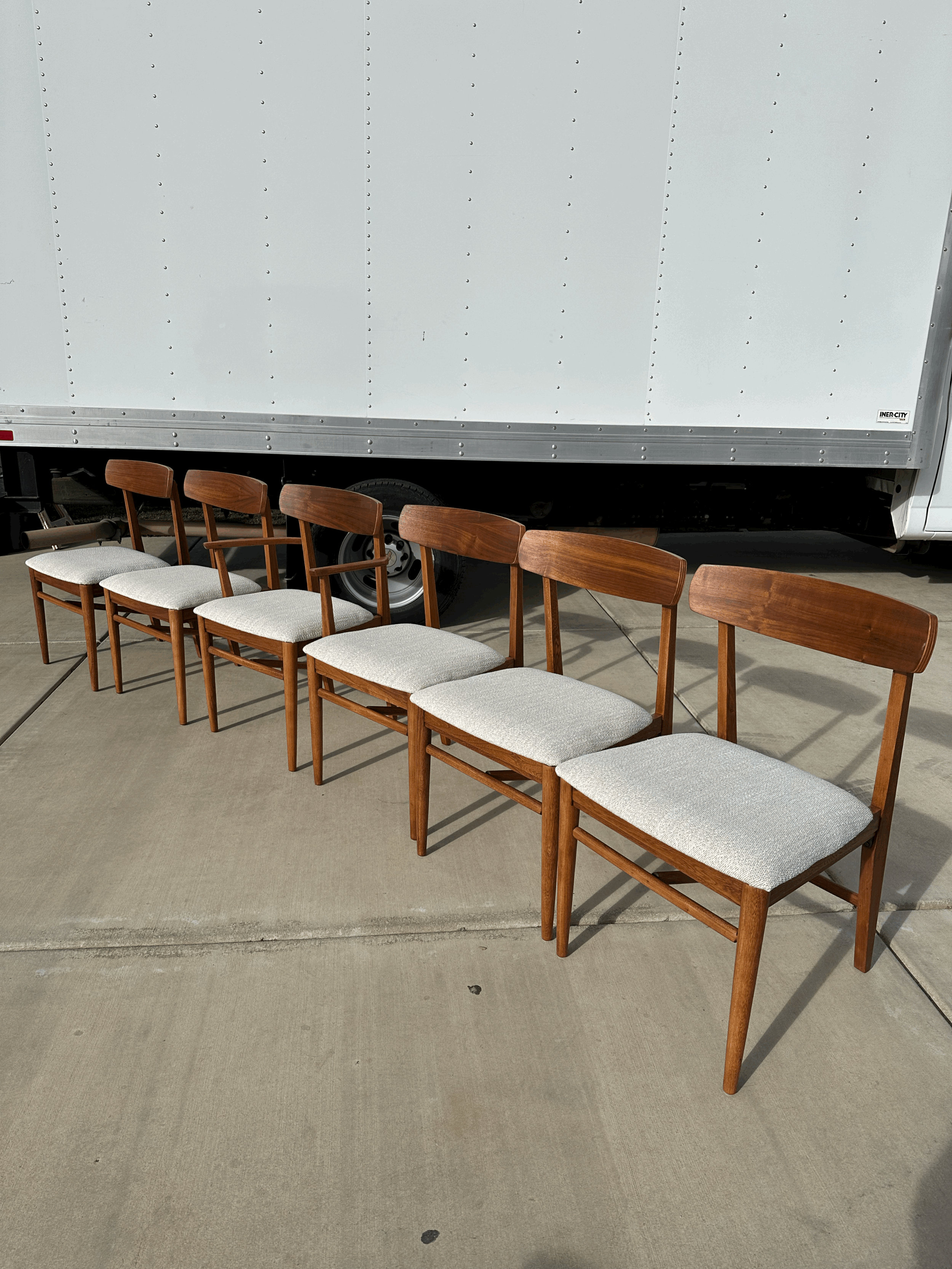 Refinished dining chairs in excellent condition. Walnut wood with new fabric. Chairs have a beautiful base design.