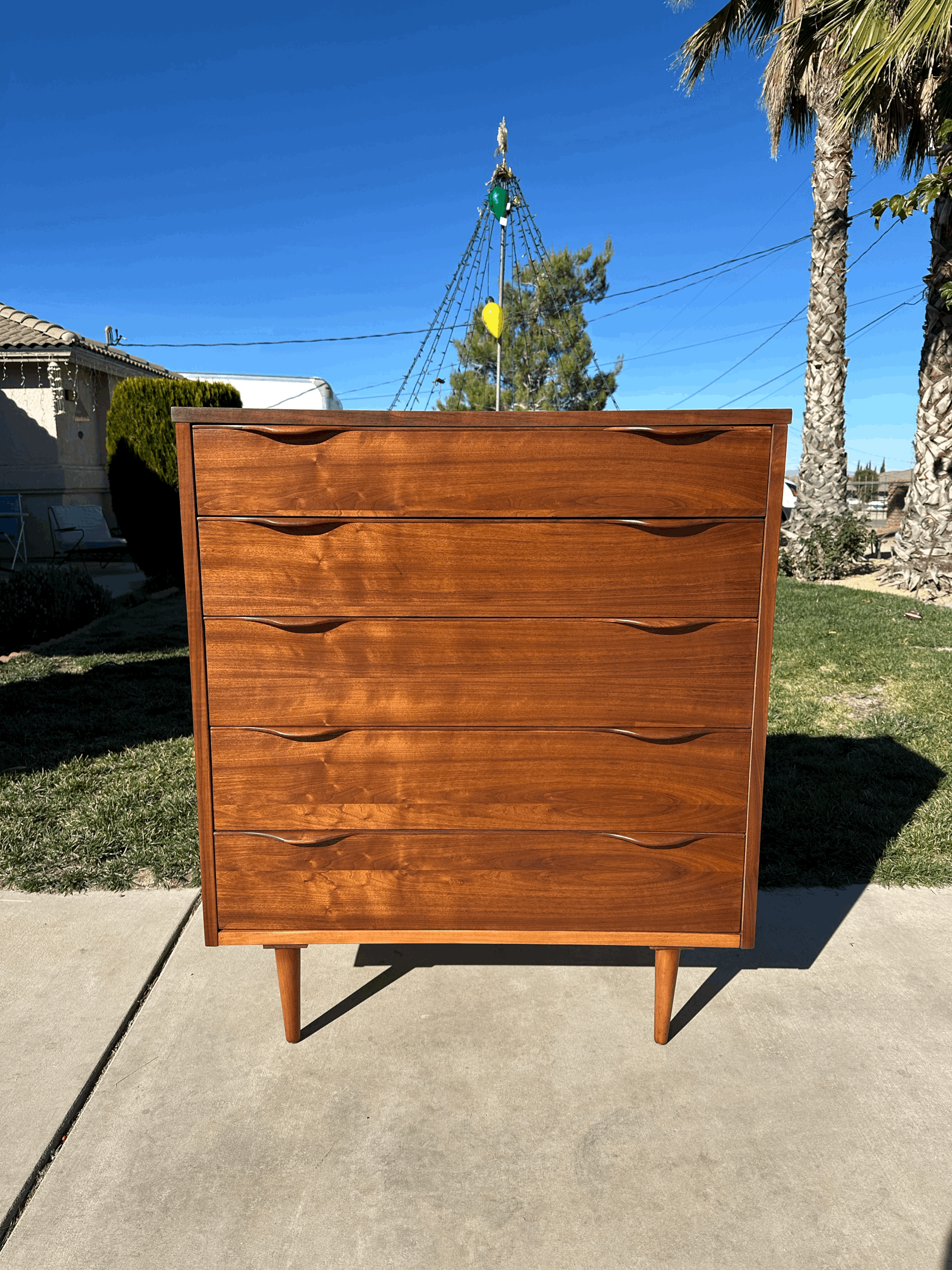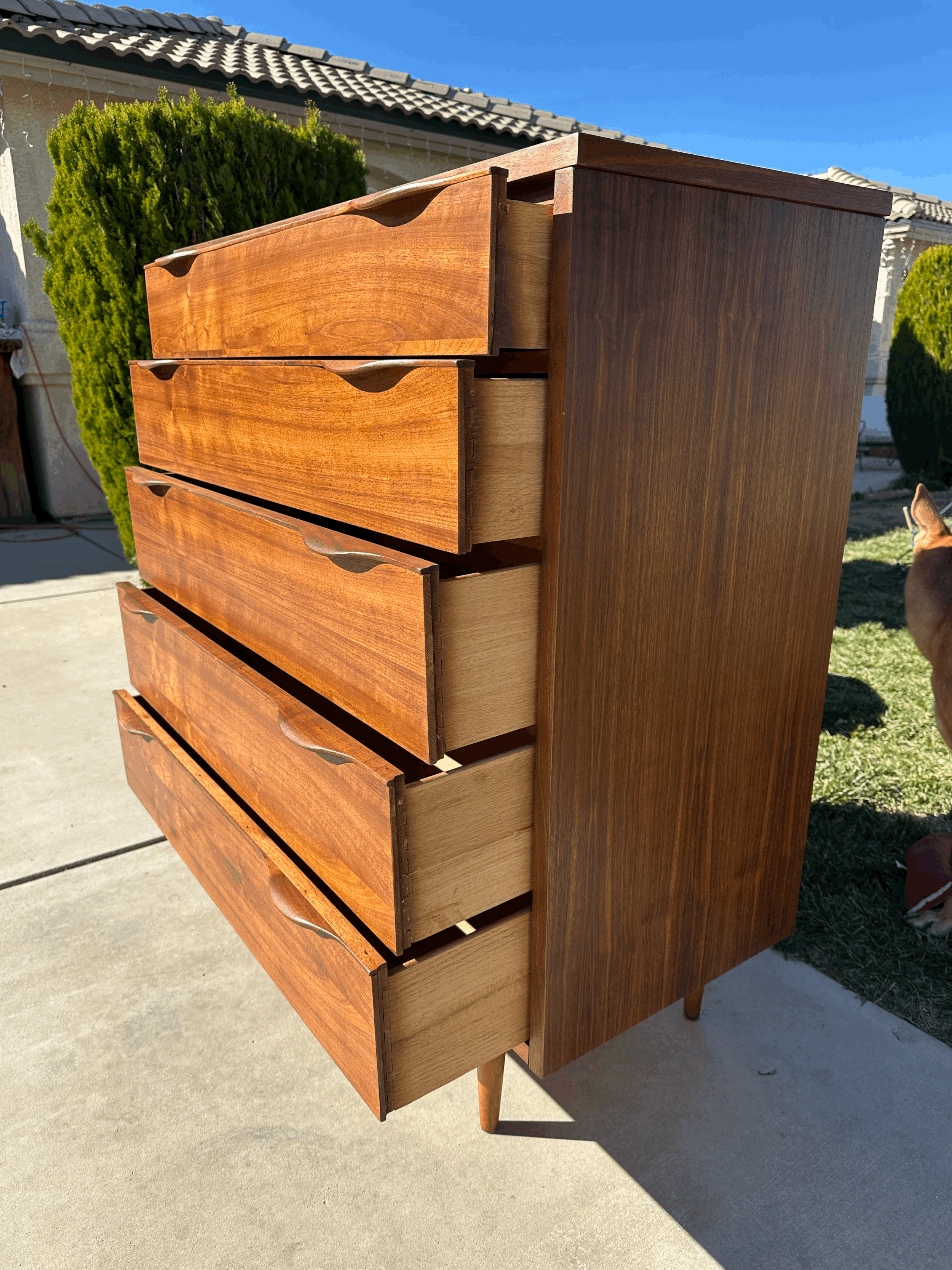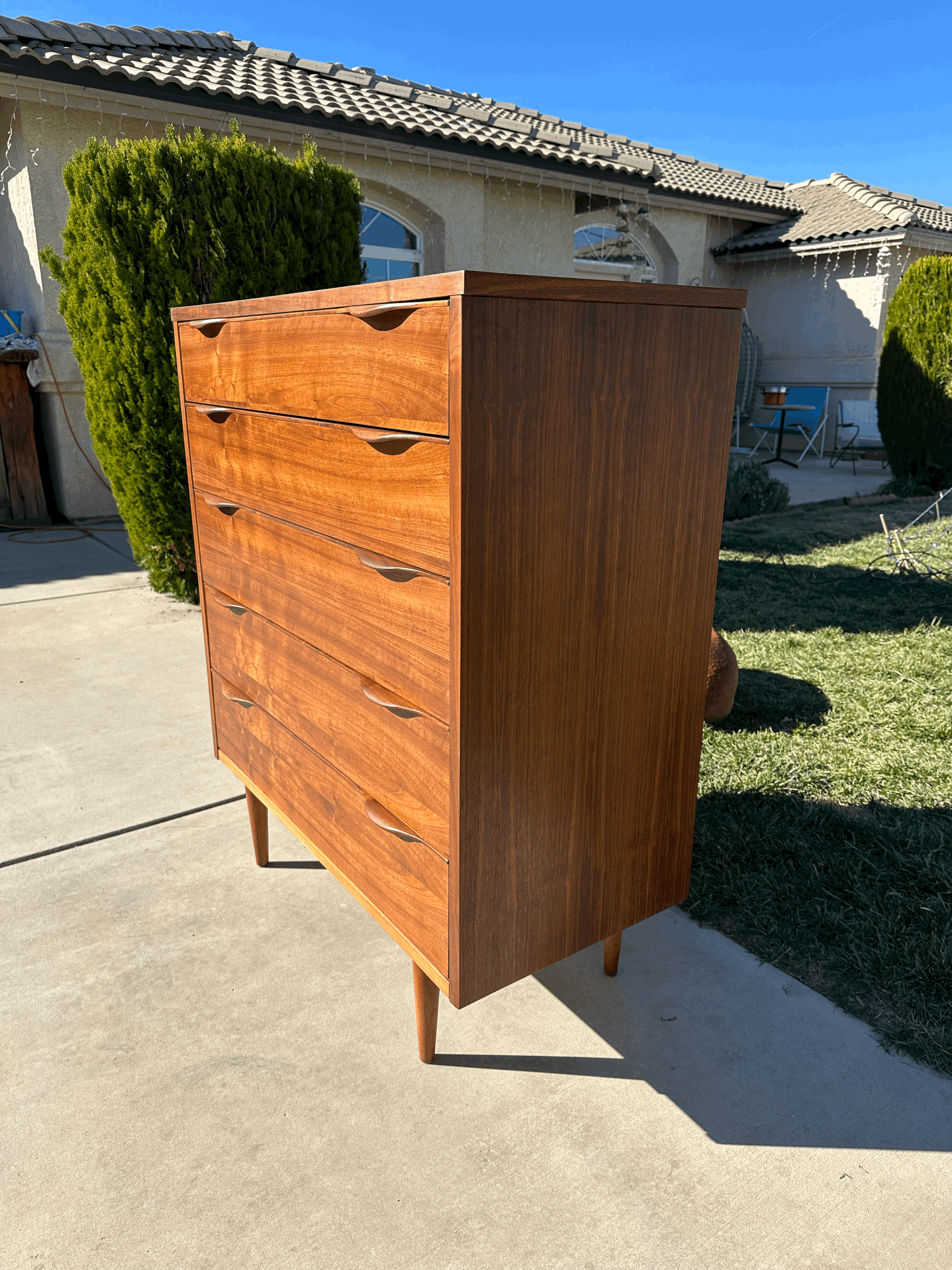 Refinished Chest of Drawers by Peter Hvidt. Teak wood made in Denmark made in the 1960s. This classic piece features 5 drawers the top 2 have dividers, with and intricate design on the edges.