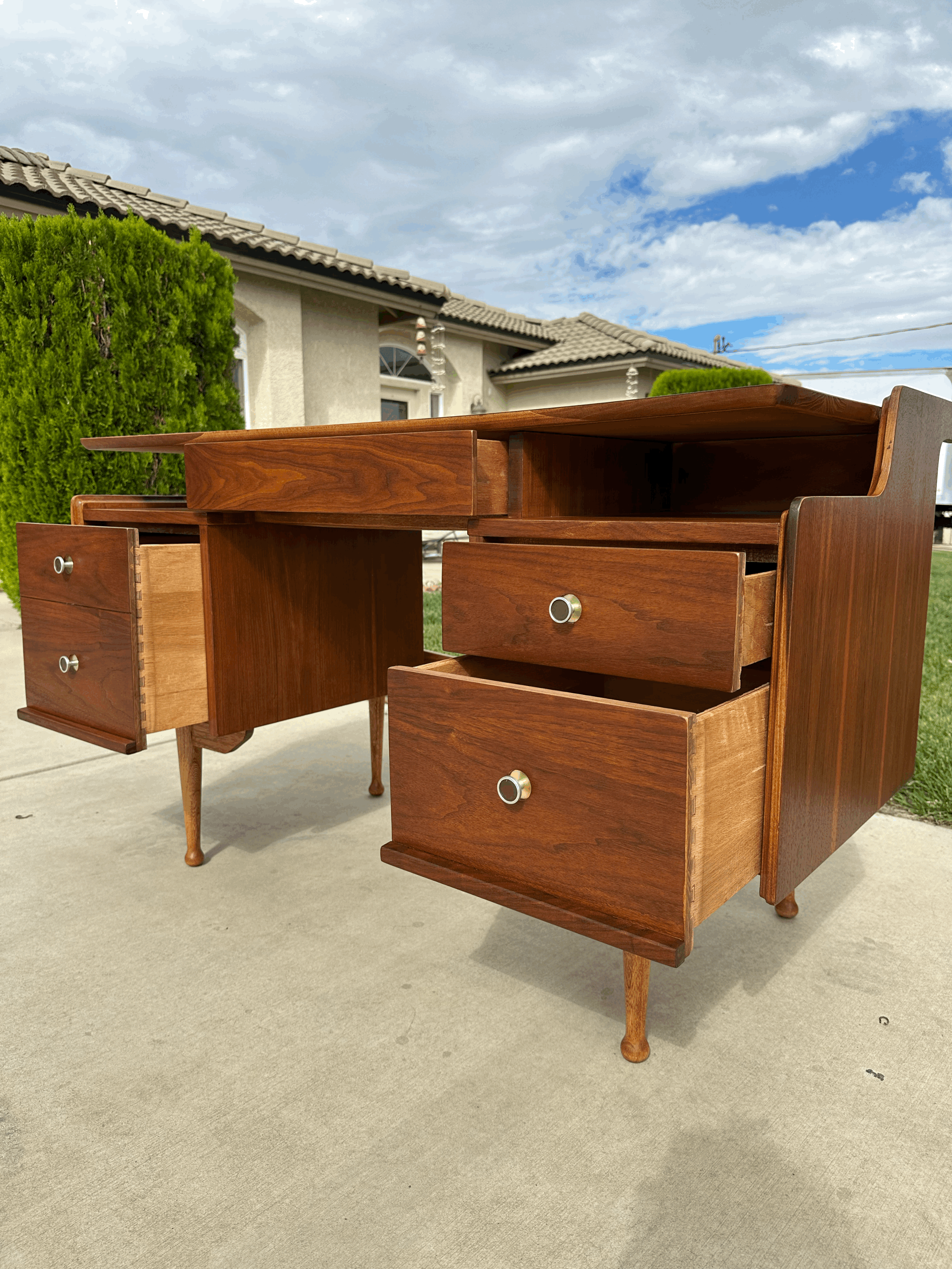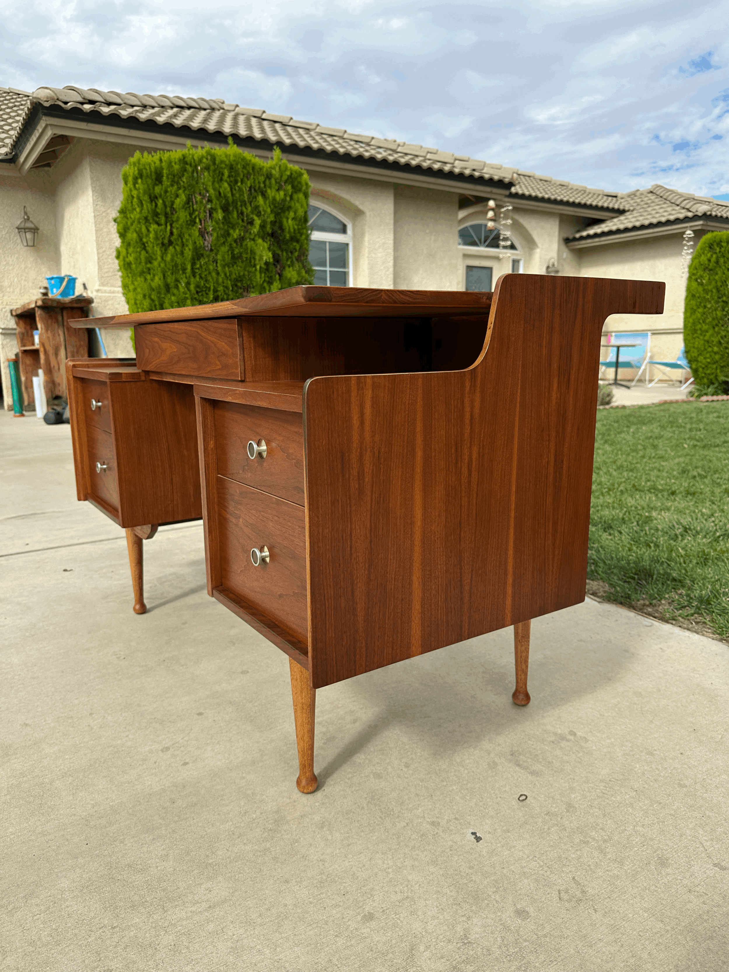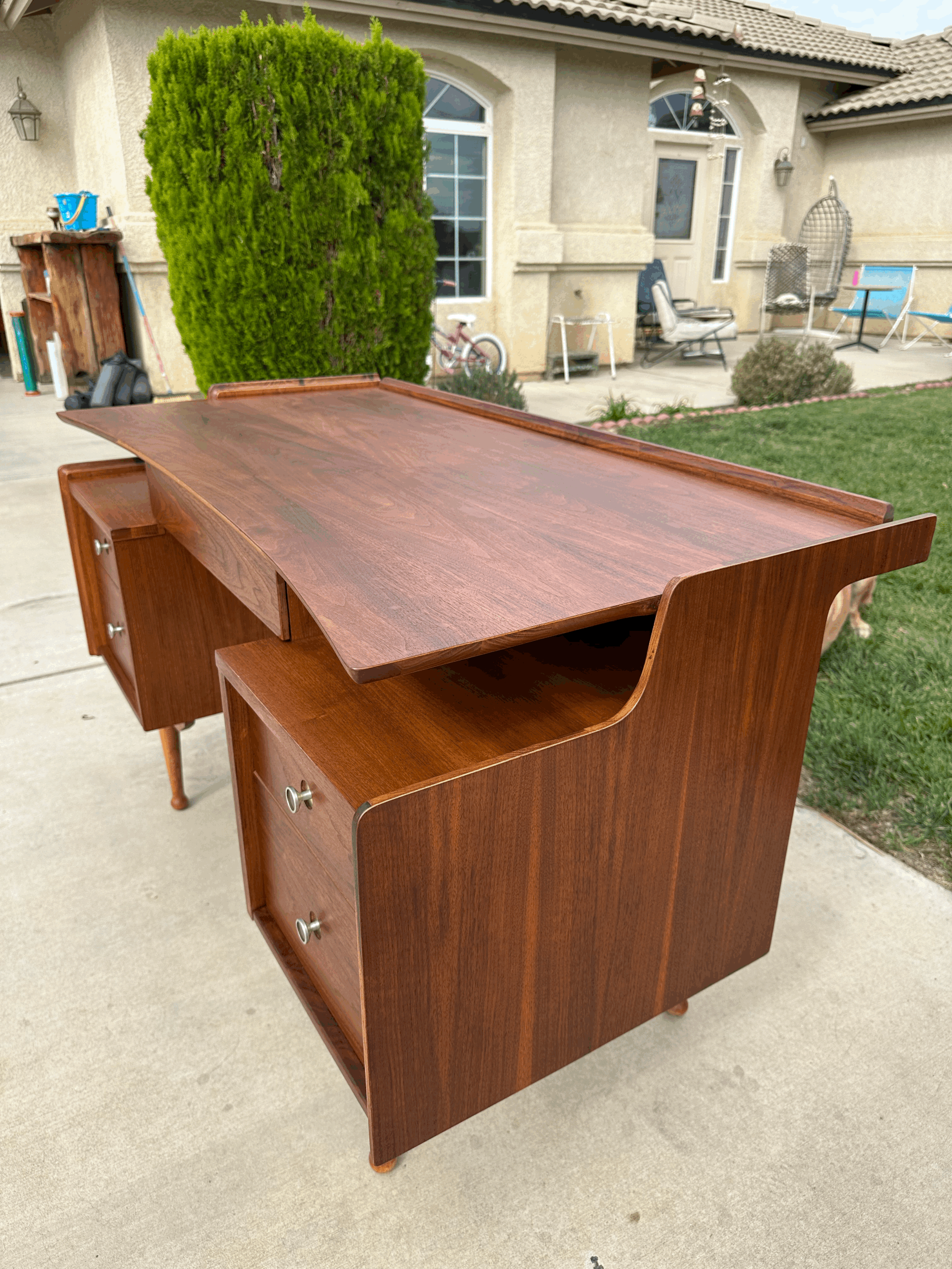 Teak executive desk refinished in excellent condition. This beautiful desk has 4 drawers one very spacious at 11 in depth the other three at 3 in depth. The desk for is a perfect subtle piece to have in an at home office.