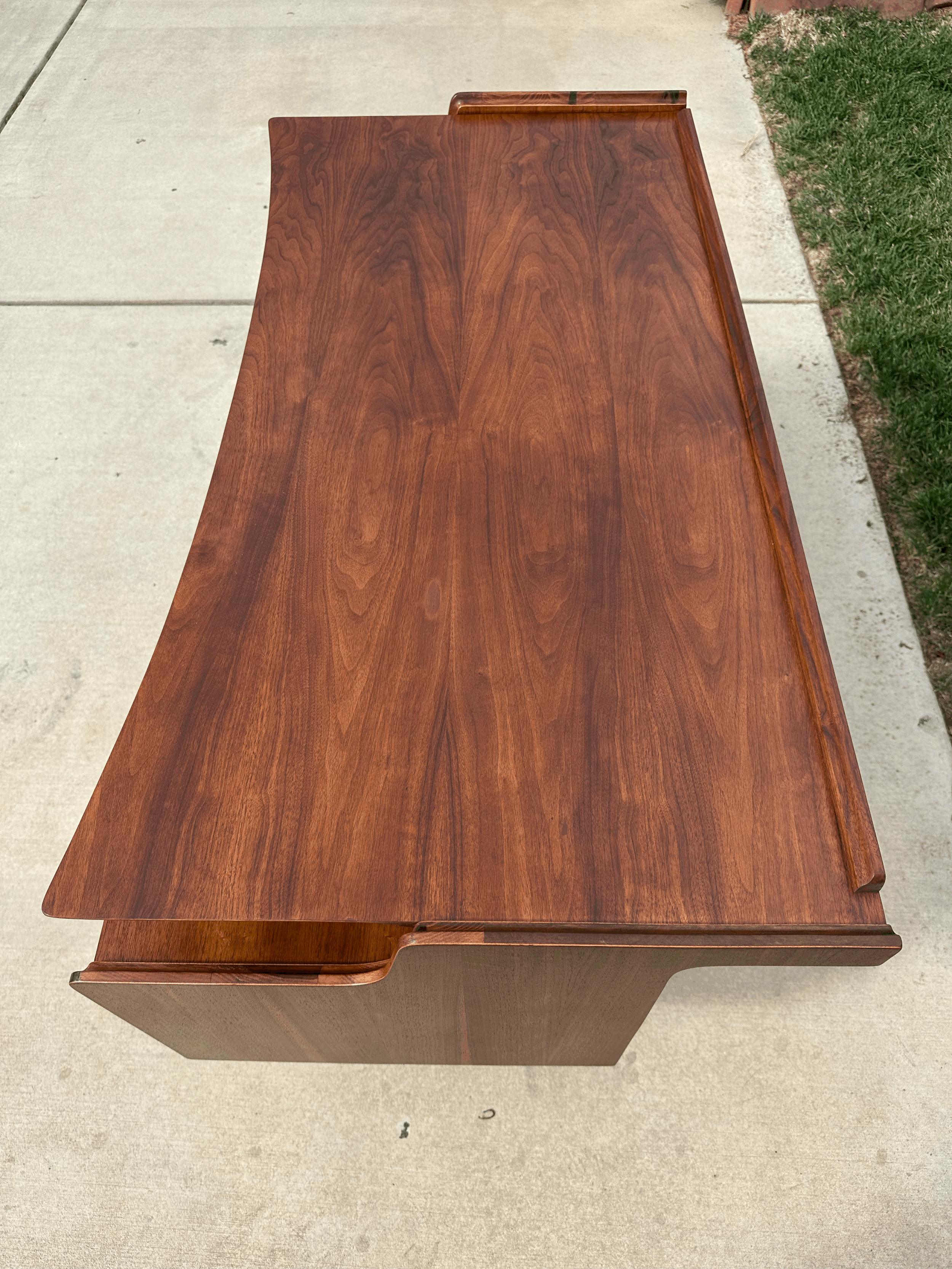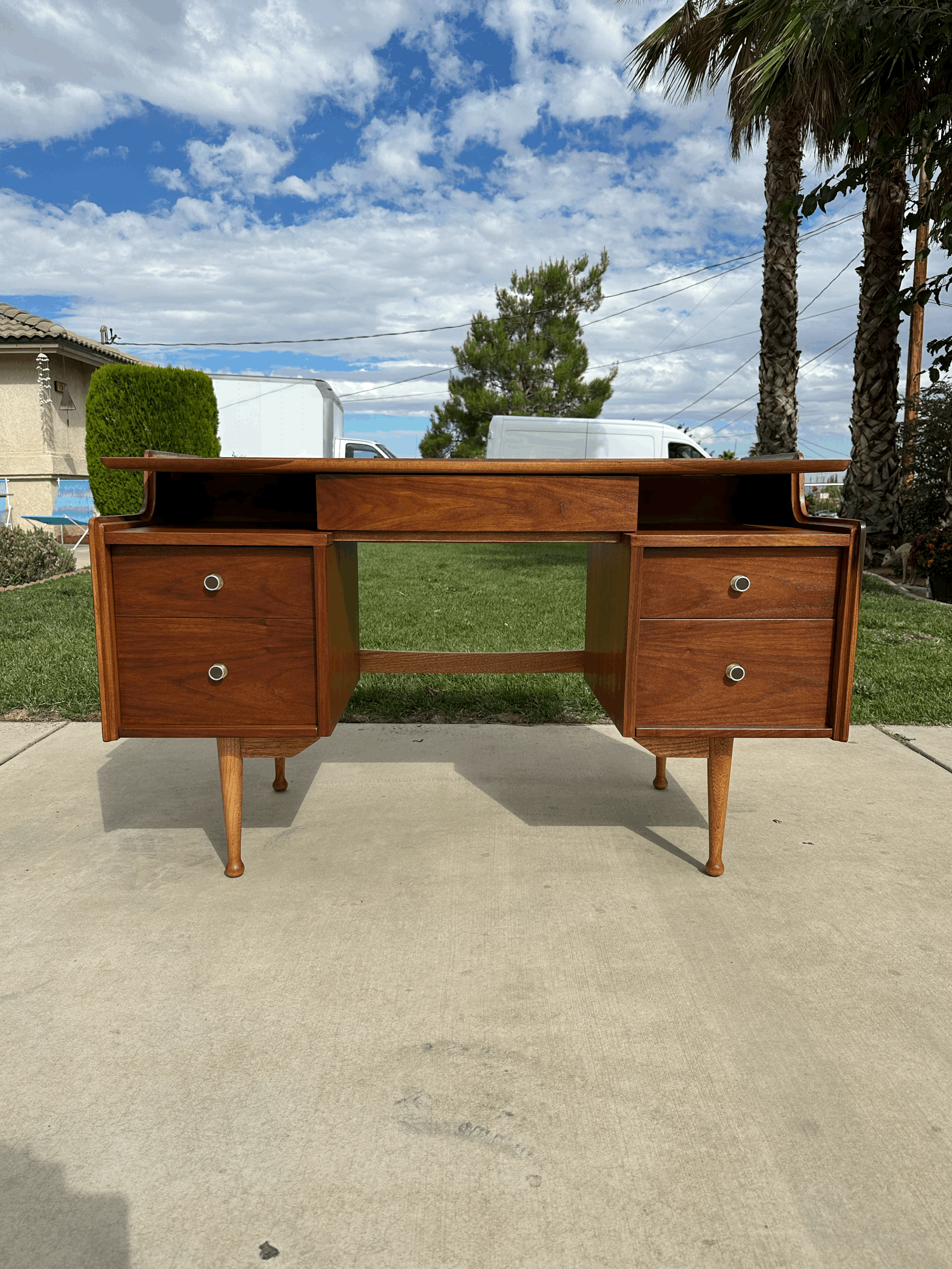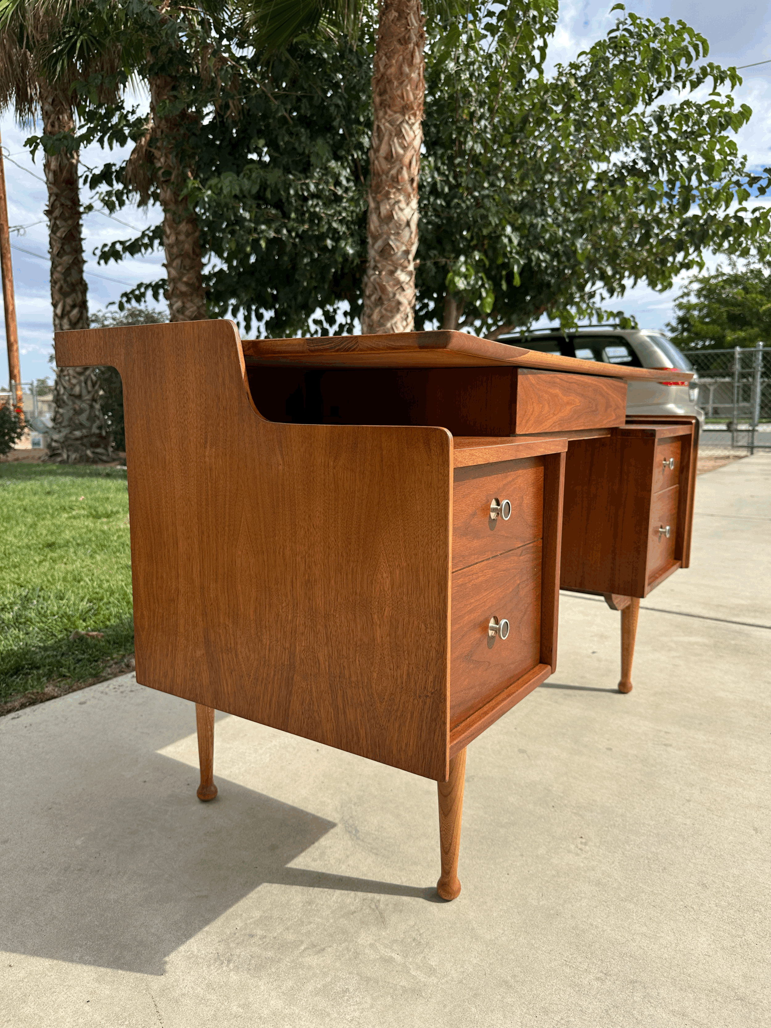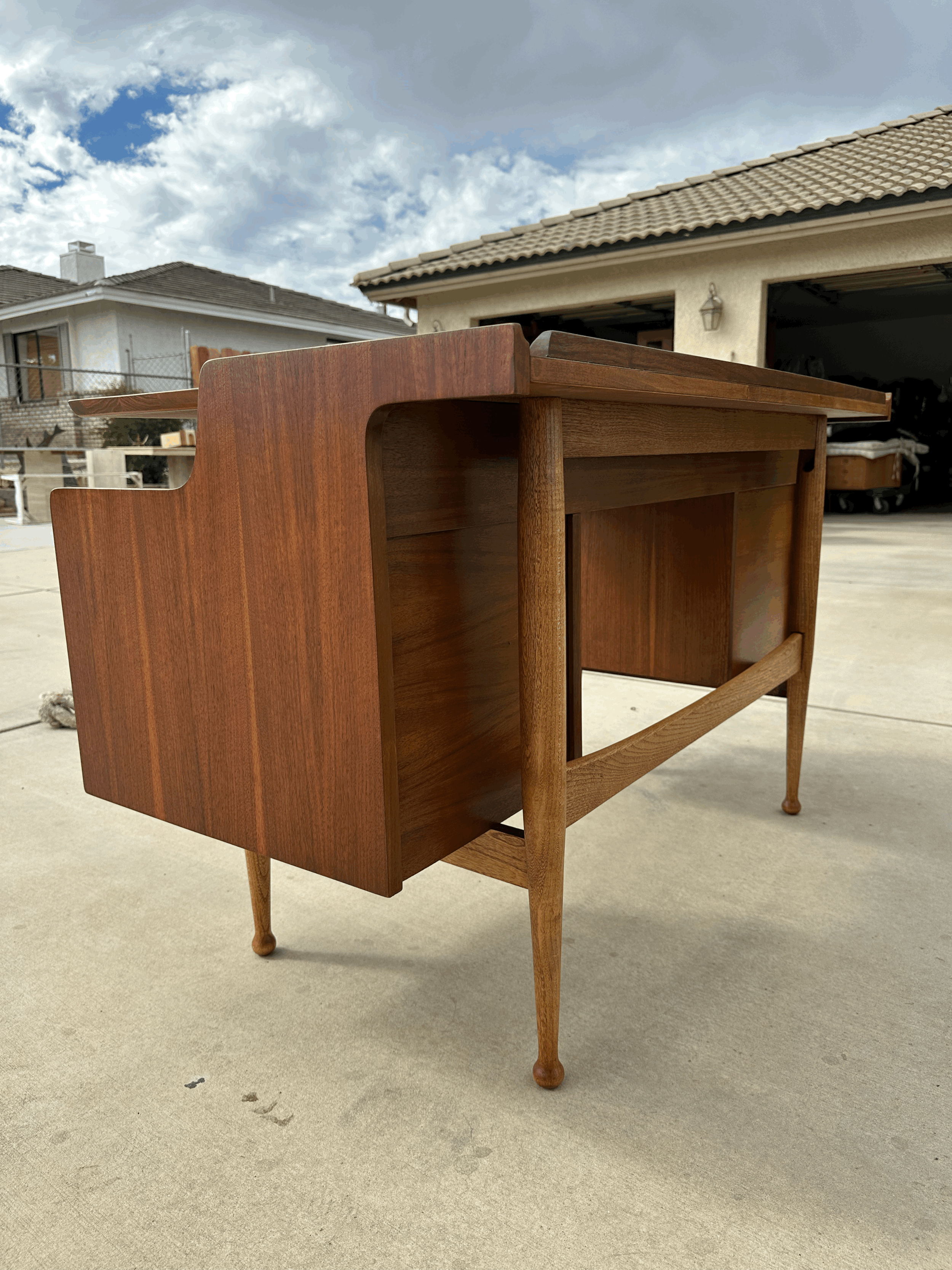 Teak executive desk refinished in excellent condition. This beautiful desk has 4 drawers one very spacious at 11 in depth the other three at 3 in depth. The desk for is a perfect subtle piece to have in an at home office.