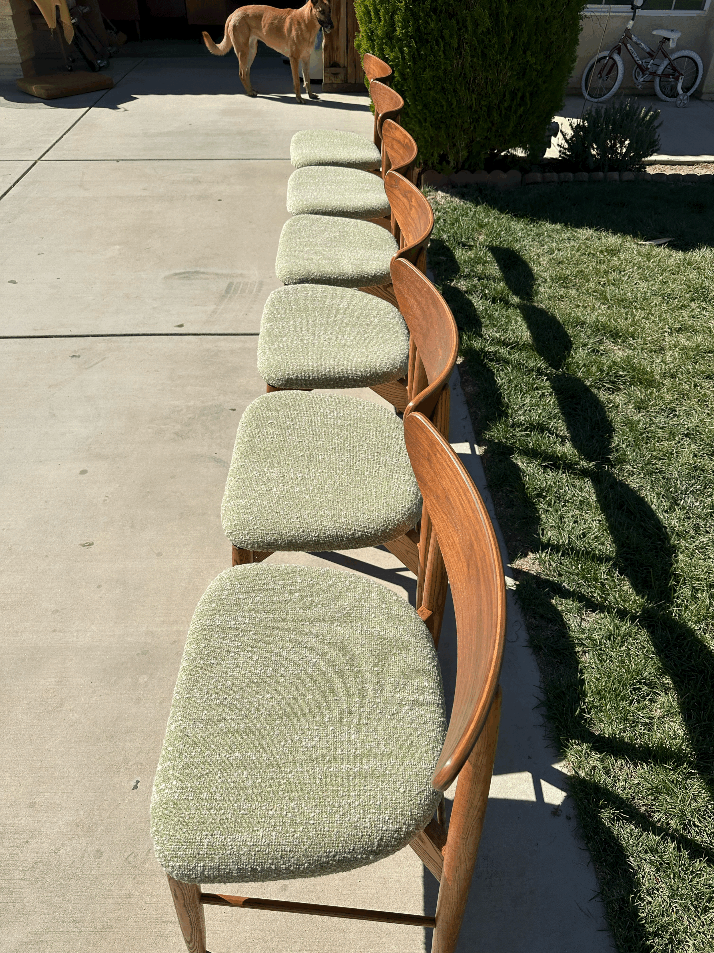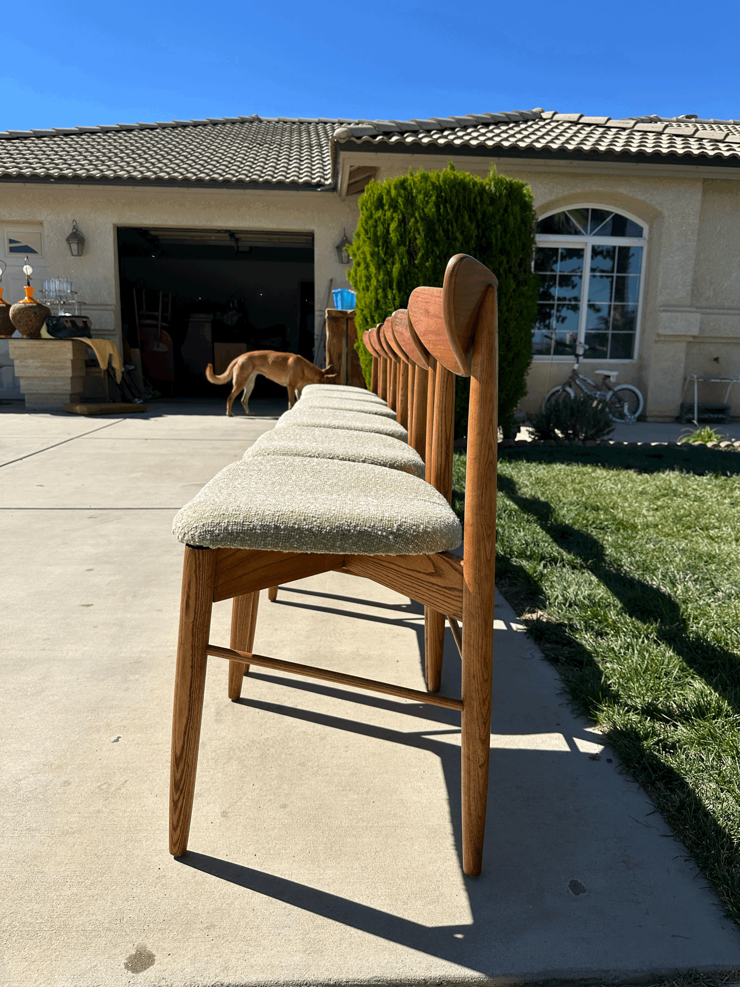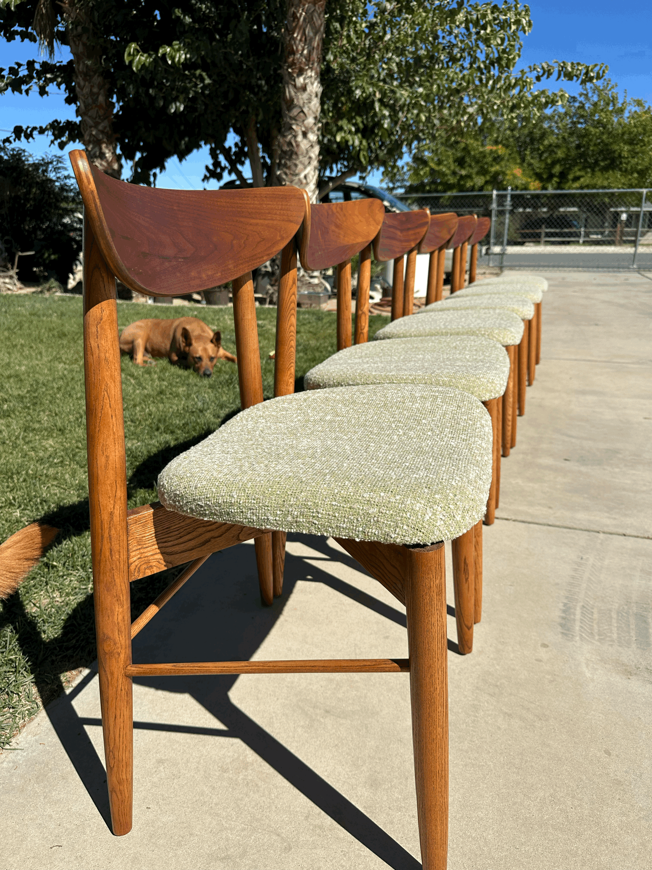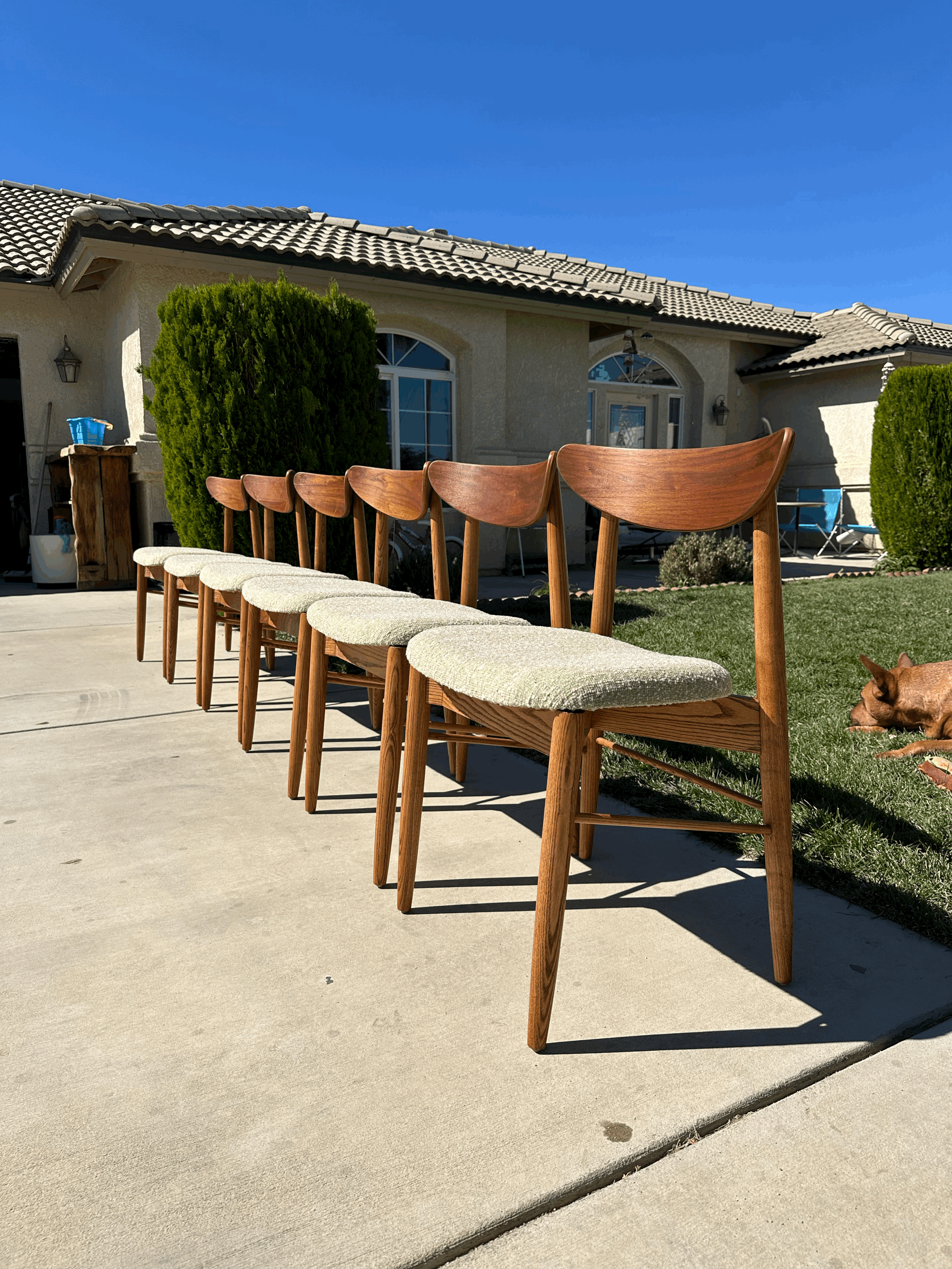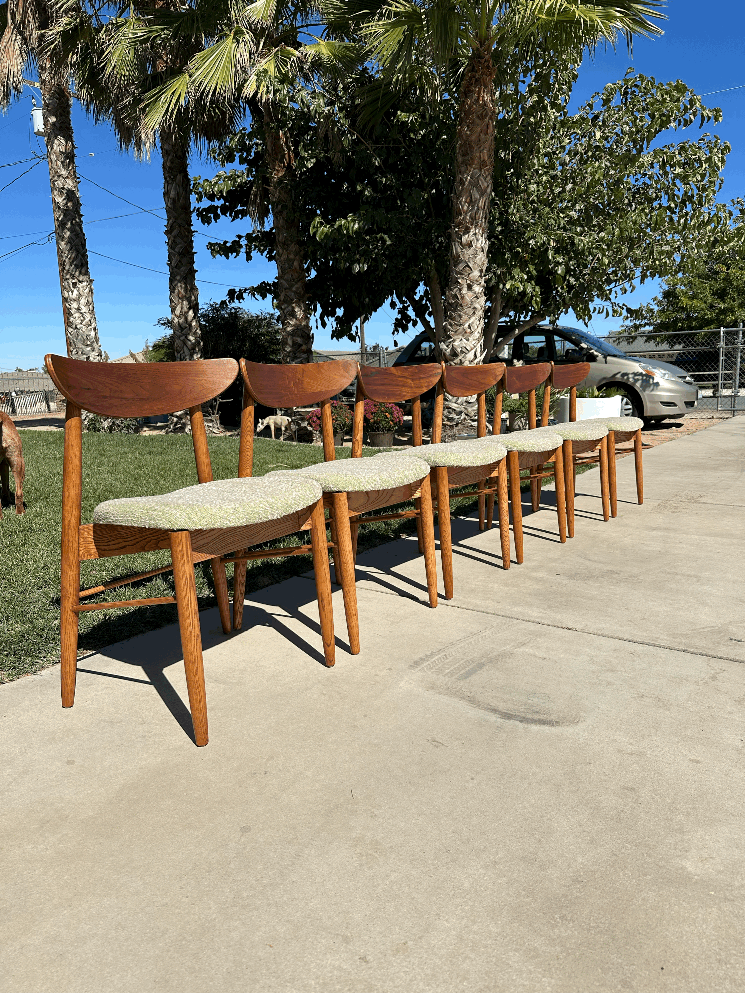 Beautiful chairs from the 60s have been completely restored. The 6 chairs have been refinished and reupholstered in a beautiful blue color, the cane has also been replaced giving it the perfect look.